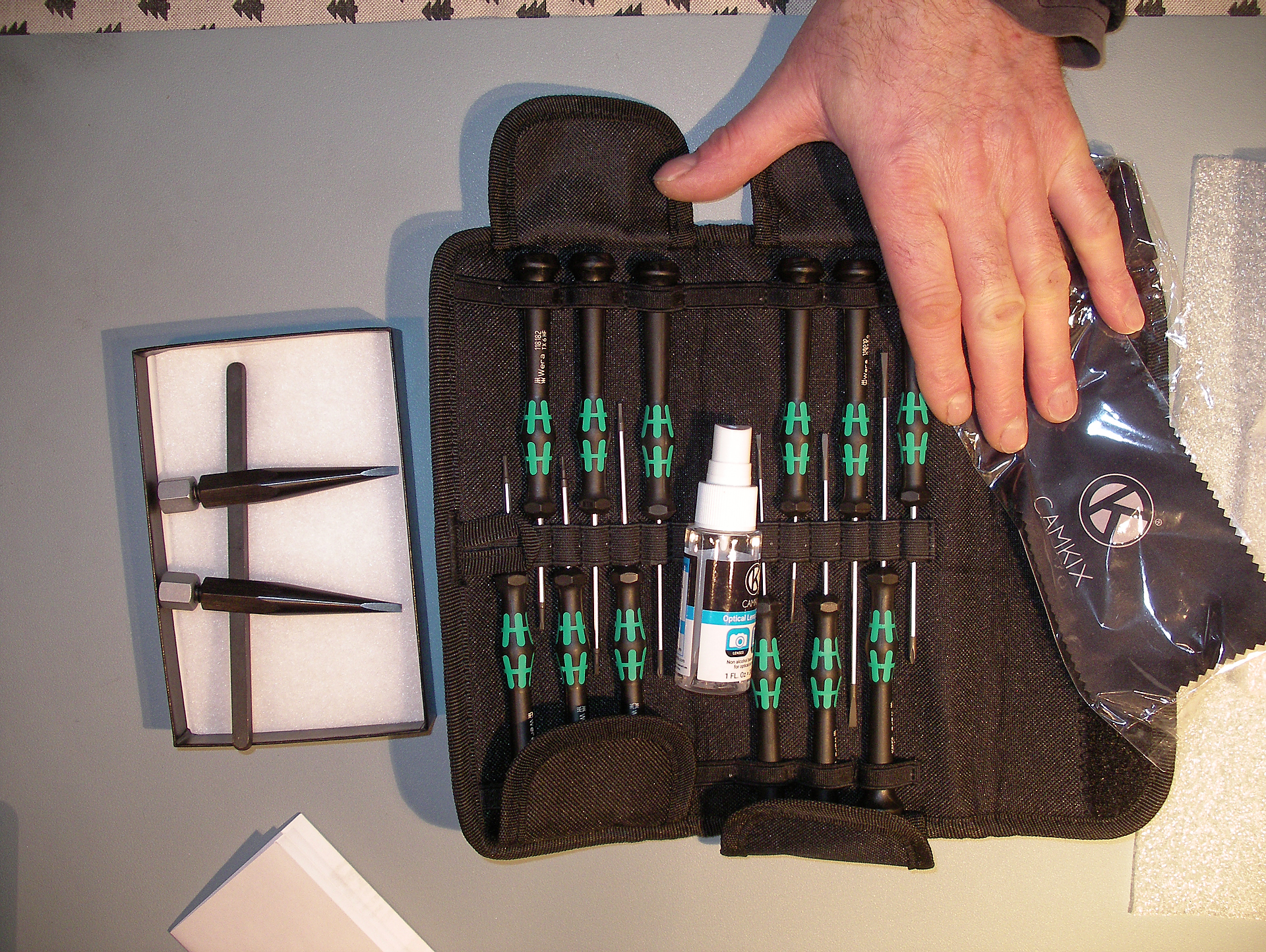Outillage : micro- tournevis crussiformes & plats. Et la clé à ergots (spanner) de chez S.K. Grimes, l'outils sur lequel il ne faut pas mégoter le prix (127$ l'ensemble à embouts plats & ronds). Si vous entrepenez ce type de démontage, n'achetez pas une chinoiserie à dix balles qui se tordra dans tous les sens au moindre effort, avec le risque de ballafrer ses lentilles.