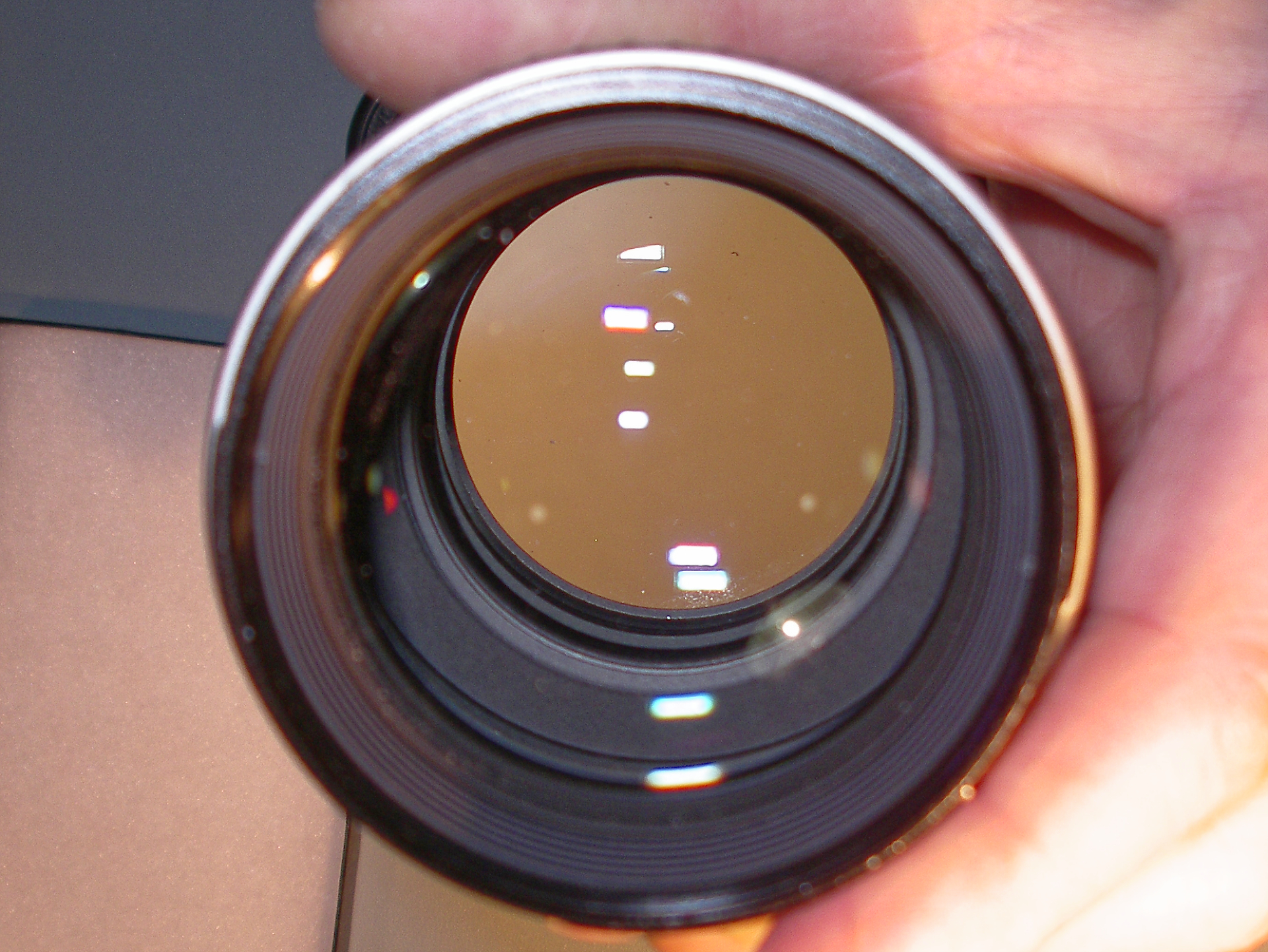 <= Vue arrière, avec la dernière lentille très concave. Peu de poussière sur ce plan, car pas dans la zone direct du diaphragme.