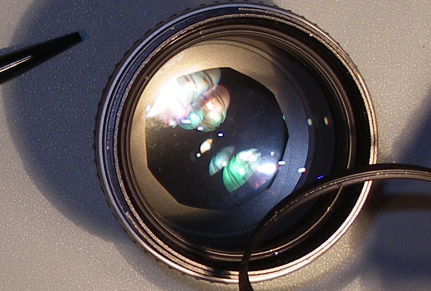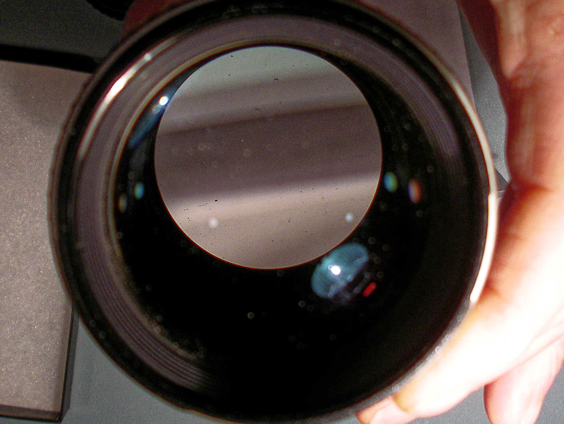 Vue des poussières dans l'objectifs. Elles se situent toutes au niveau du plan de diaphragme, ce dernier les diffusant à chaque action.