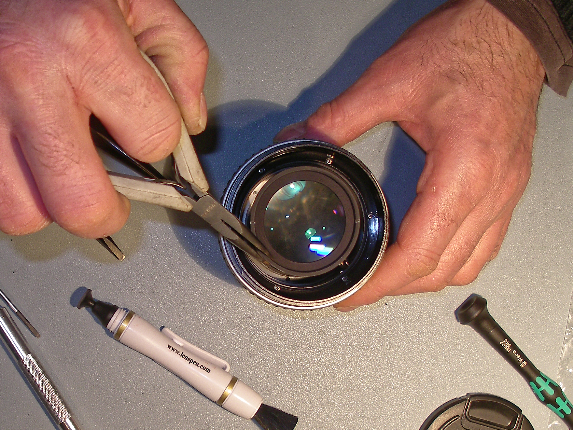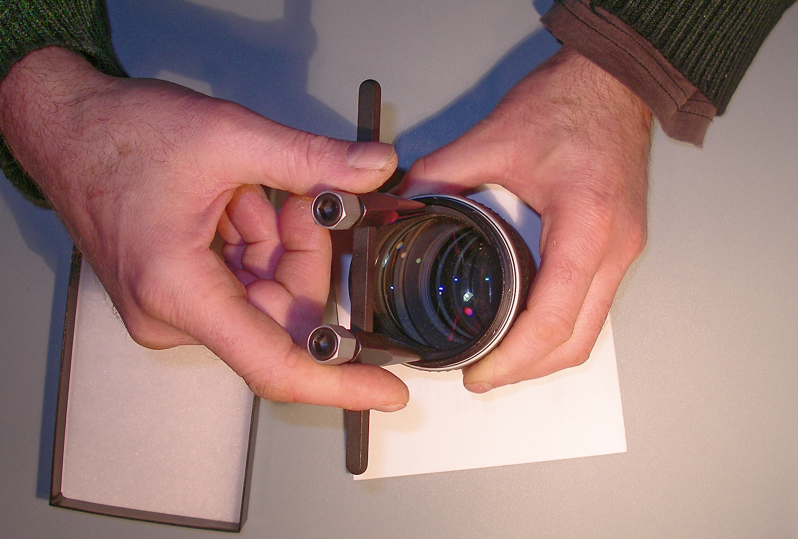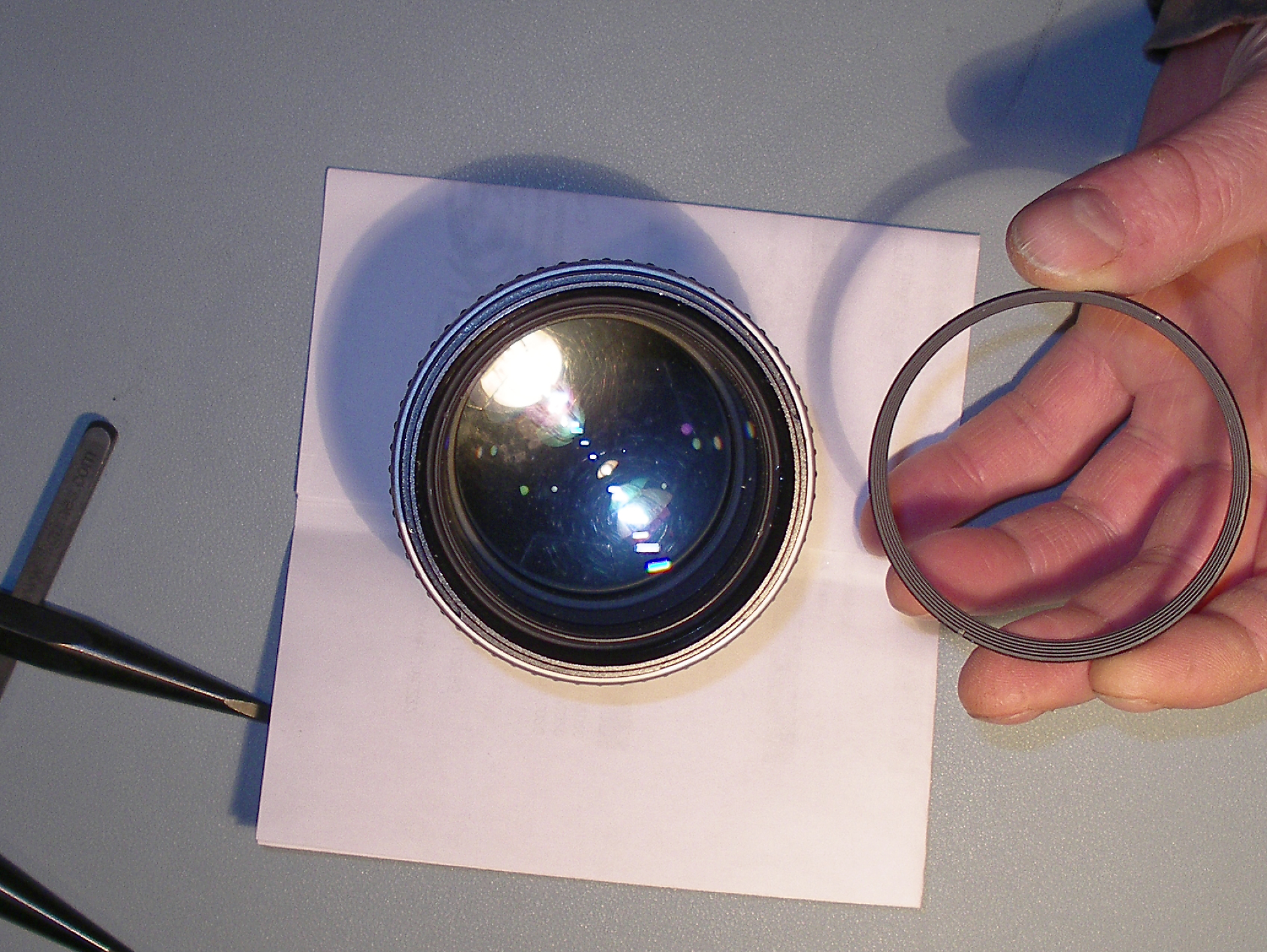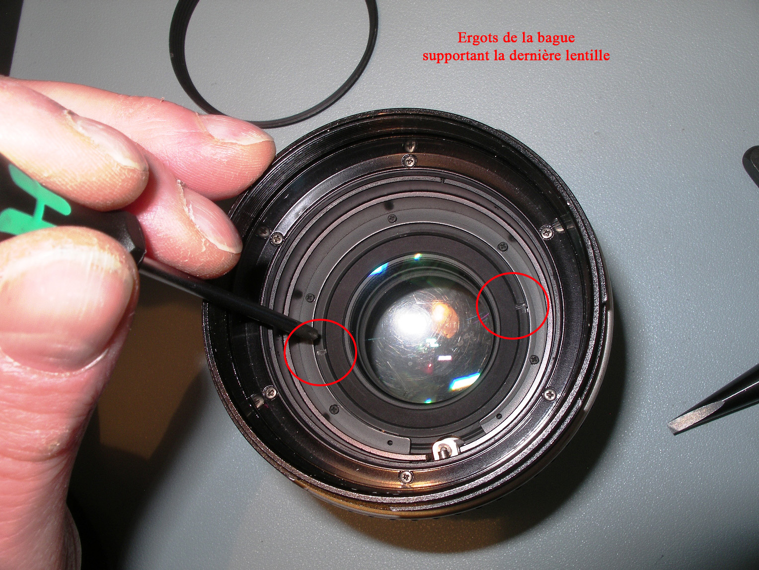Démontage de la 1ère bague, l'effort est important. Bien visser les ergots de la clé sur sa traverse. Positionner fermement l'objectif sur le plan de travail, en appui sur son bouchon arrière. Avec la clé, il faut autant d'effort en appui qu'en rotation, pour qu'il ne rippe pas.