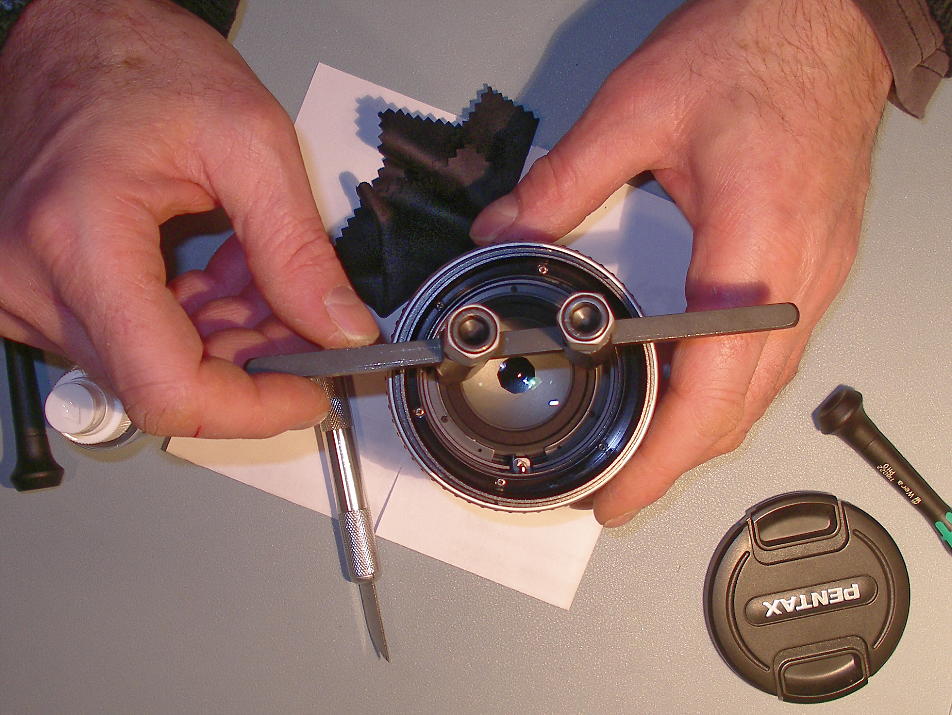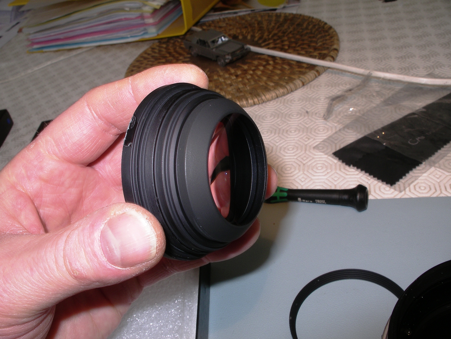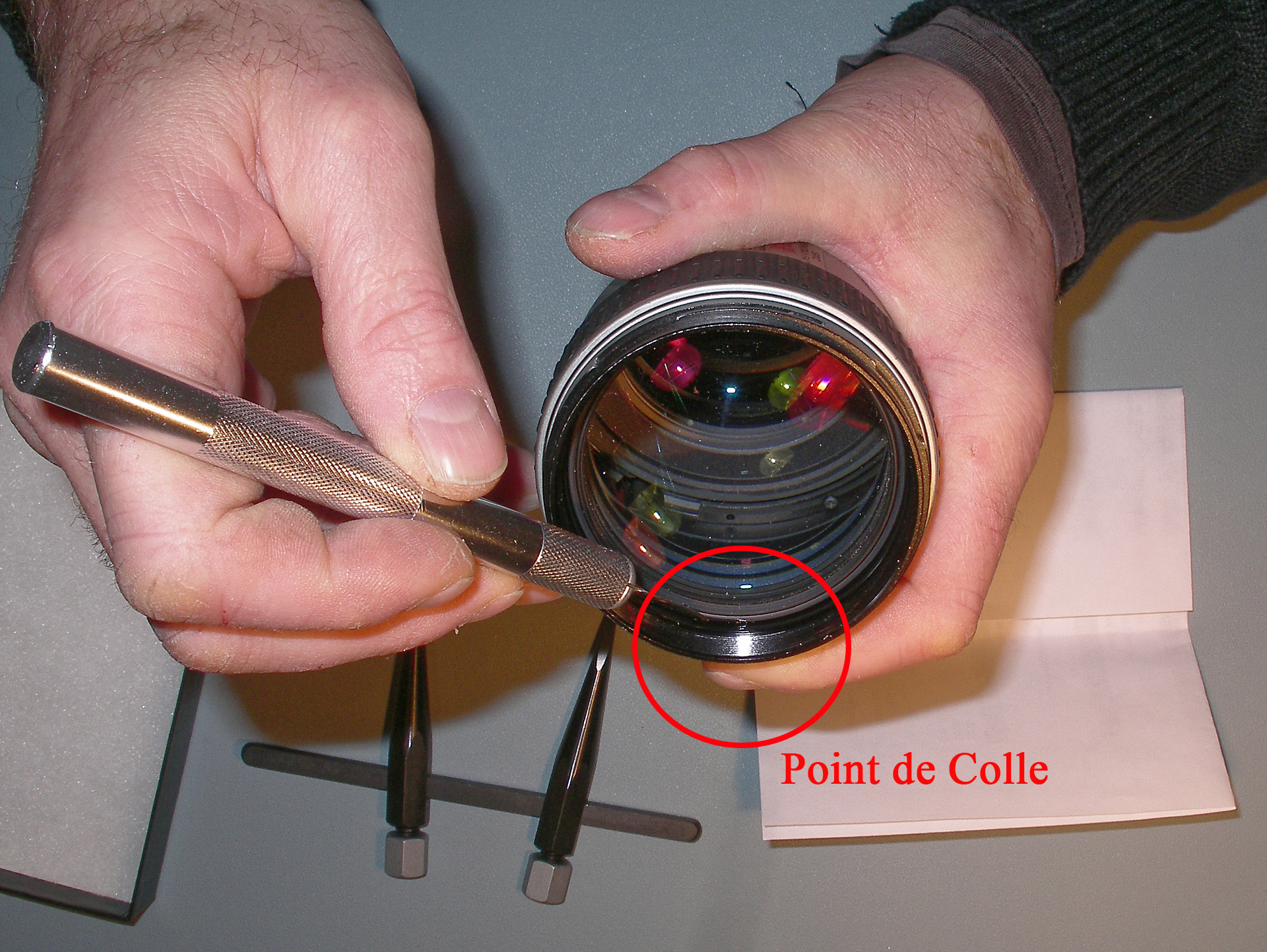 Avec un scalpel, il faut virer la goutte de colle de retenue du bloc frontal de lentilles, pour pouvoir le démonter. Ça a plus l'aspect d'une colle translucide que de frein-filet type Loctite.