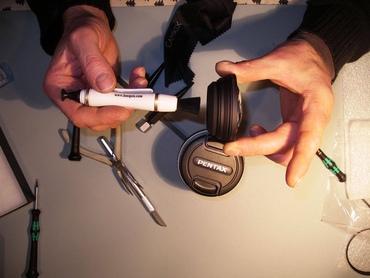 <= Nettoyage des poussières dans le plan du diaphragme. L'idéal aurait été de monter ce type de pinceau sur un aspirateur, pour le mettre en dépression, et bien retenir les poussières.