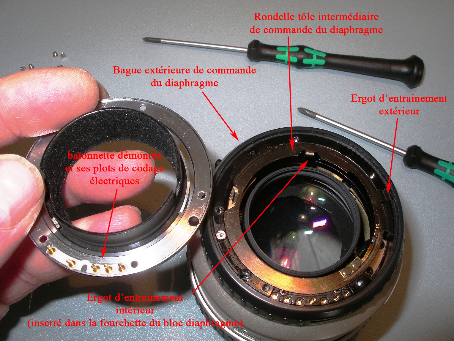 Il faudra aussi nettoyer la lentille en arrière du plan de diaphragme, ce dernier bloqué en pleine ouverture.
