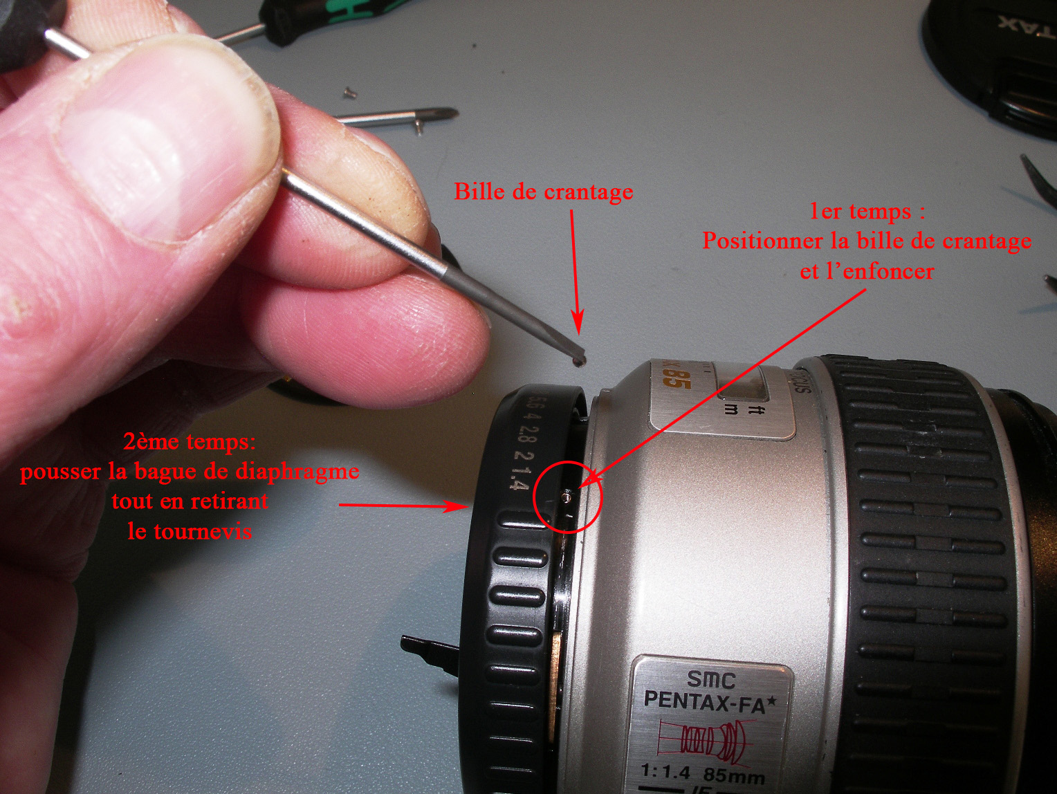 Métode pour remettre la bille de crantage sans perdre ses nerfs... On pose la bille sur le ressort, on l'enfonce, on pousse la bague vers l'objectif tout en retirant le tournevis.