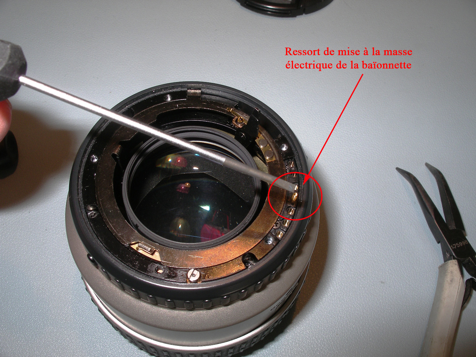 Bien faire attention aux plots de contact électriques de la baïonnette, y compris le ressort de mise à la masse qui devrait resté sur l'objectif.