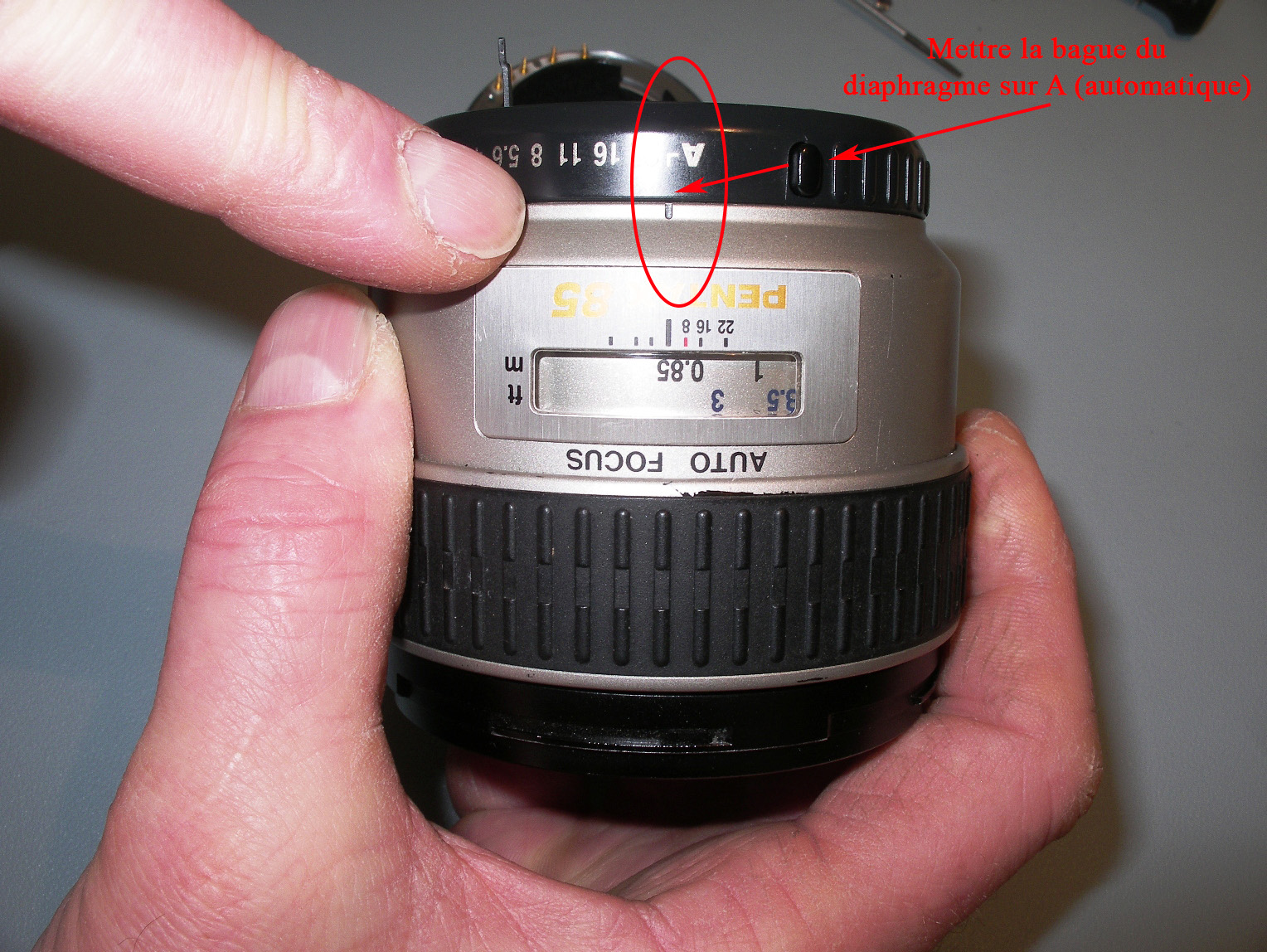 <= On met la bague de diaphragme sur "A" pour faciliter le remontage de la baïonnette.