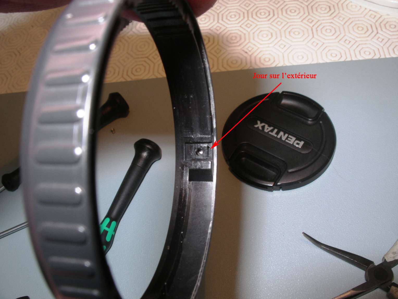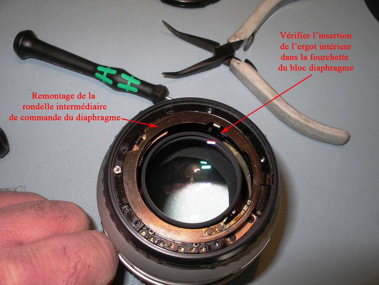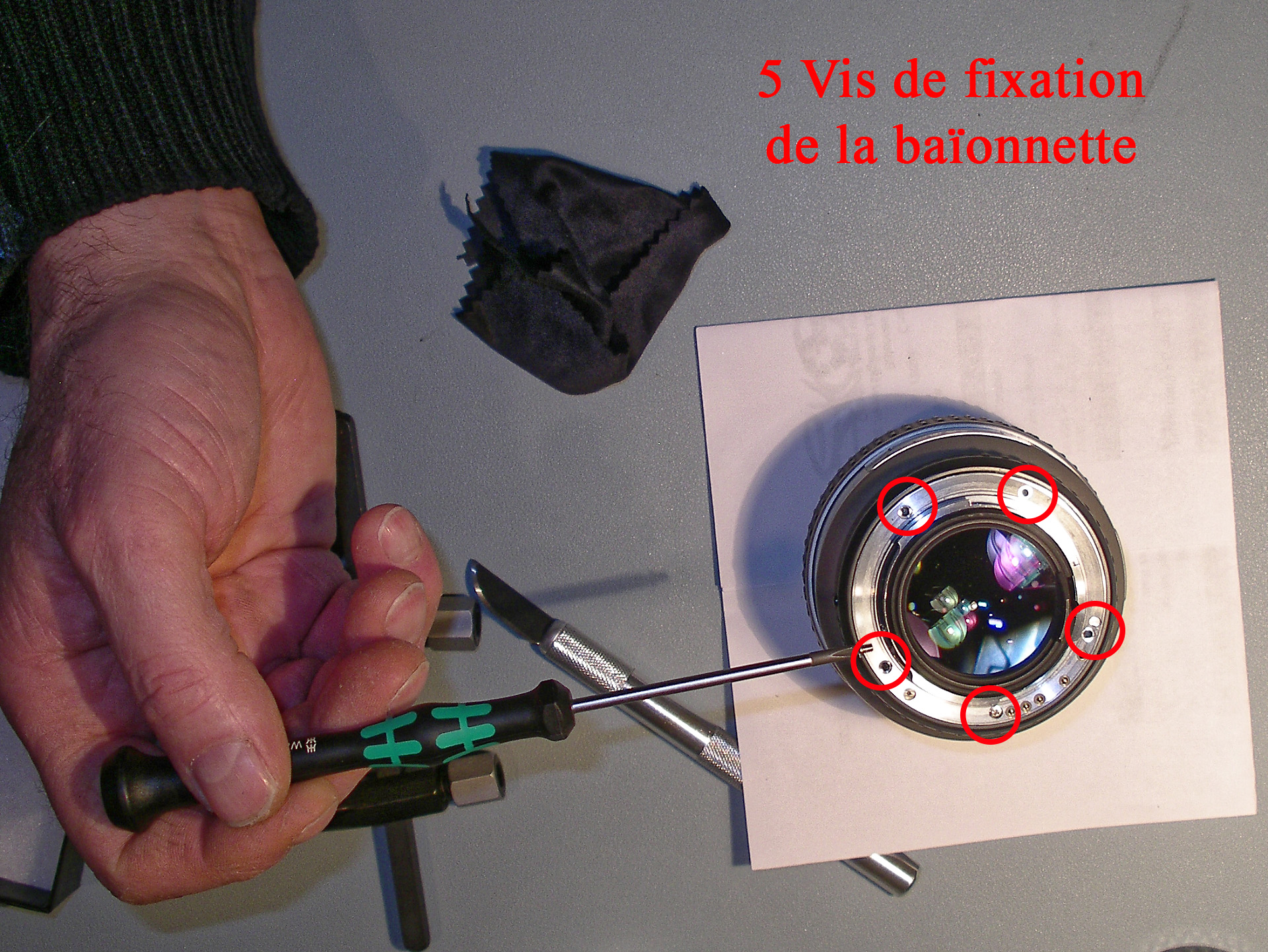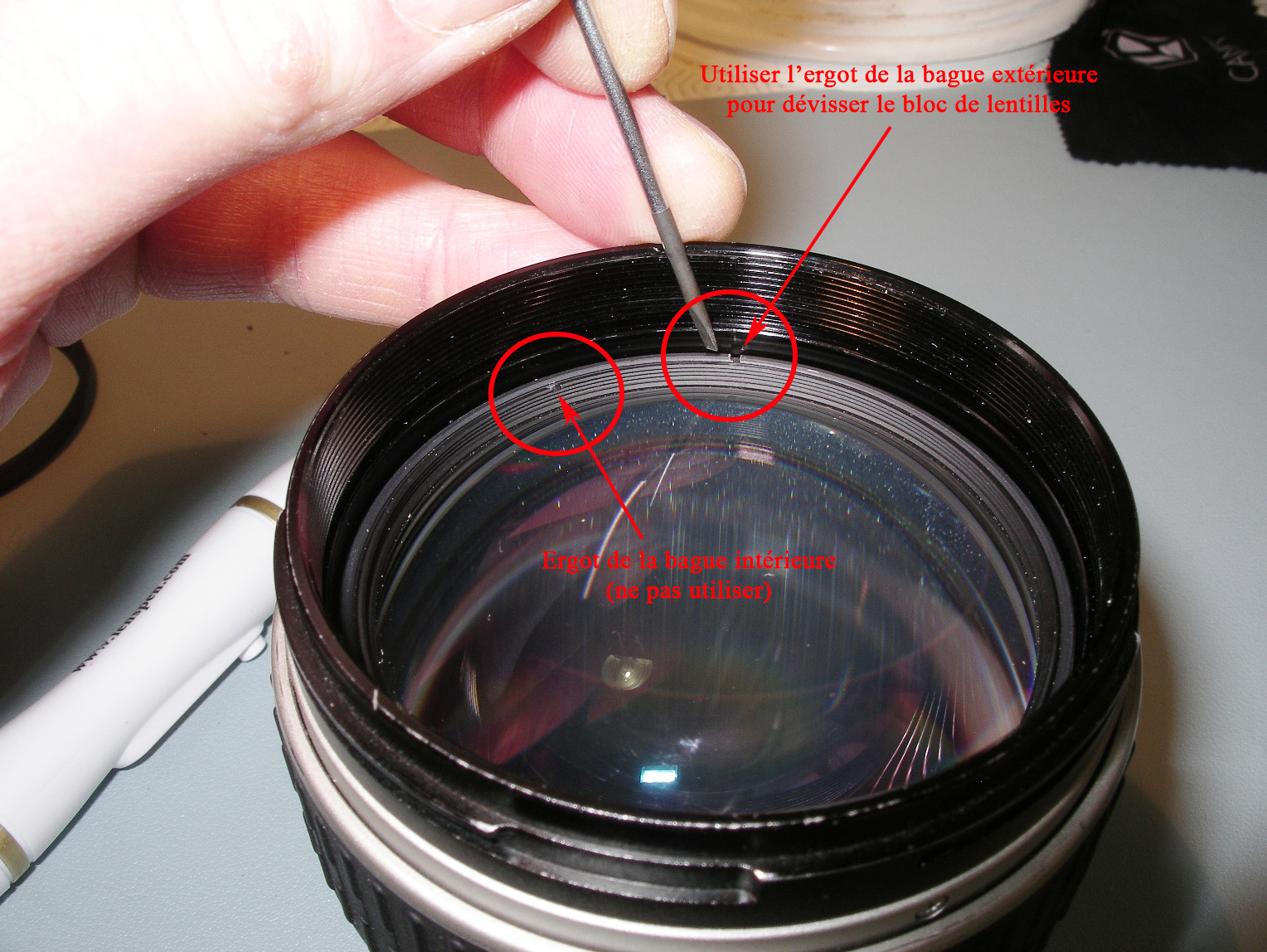 Démontage de la 1ère bague, l'effort est important. Bien visser les ergots de la clé sur sa traverse. Positionner fermement l'objectif sur le plan de travail, en appui sur son bouchon arrière. Avec la clé, il faut autant d'effort en appui qu'en rotation, pour qu'il ne rippe pas.