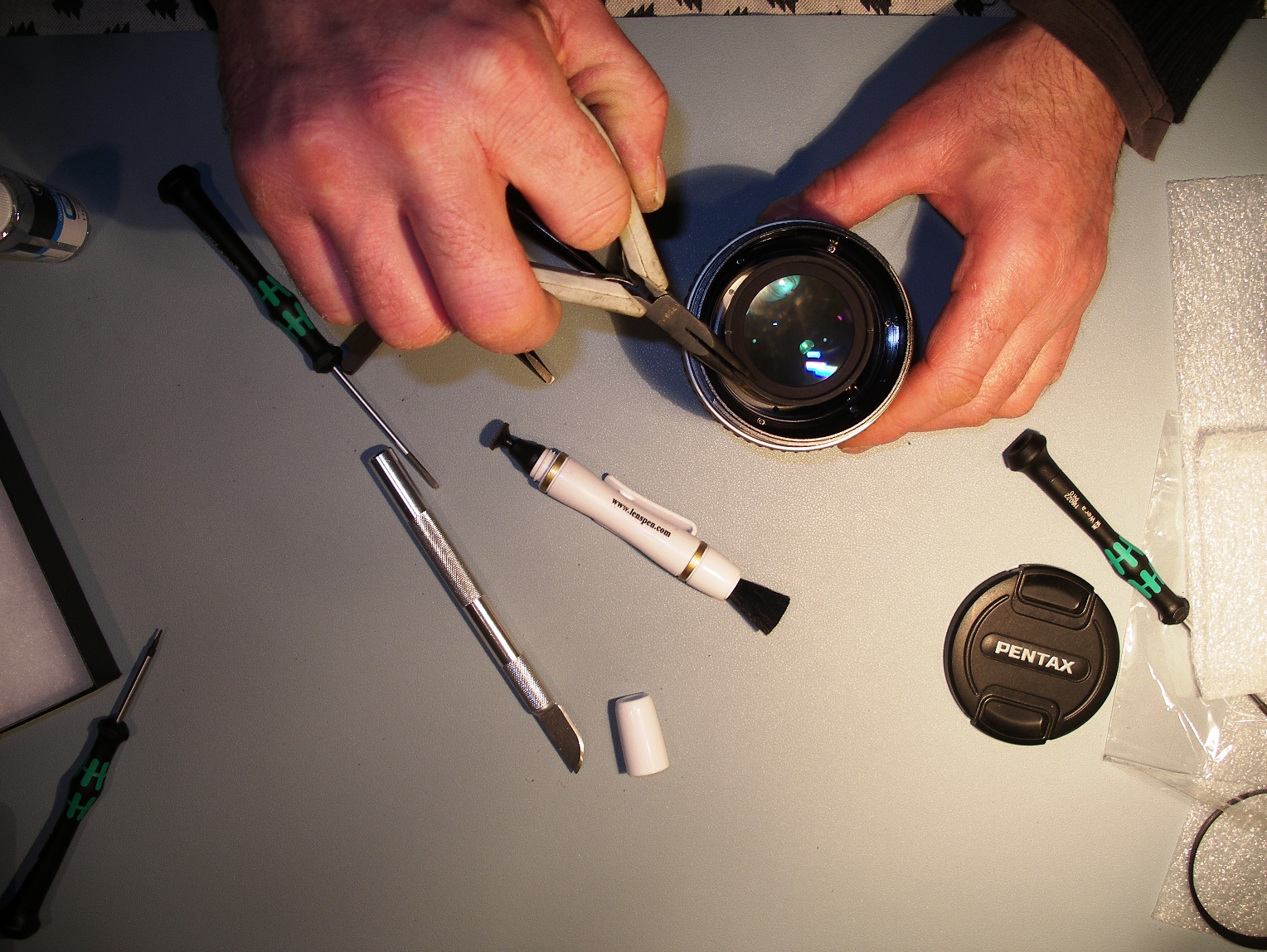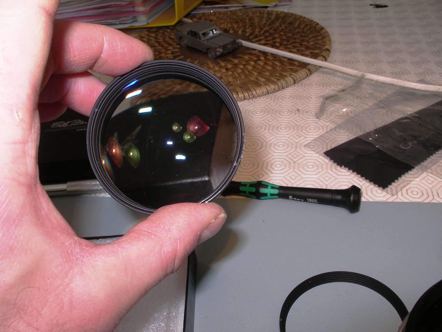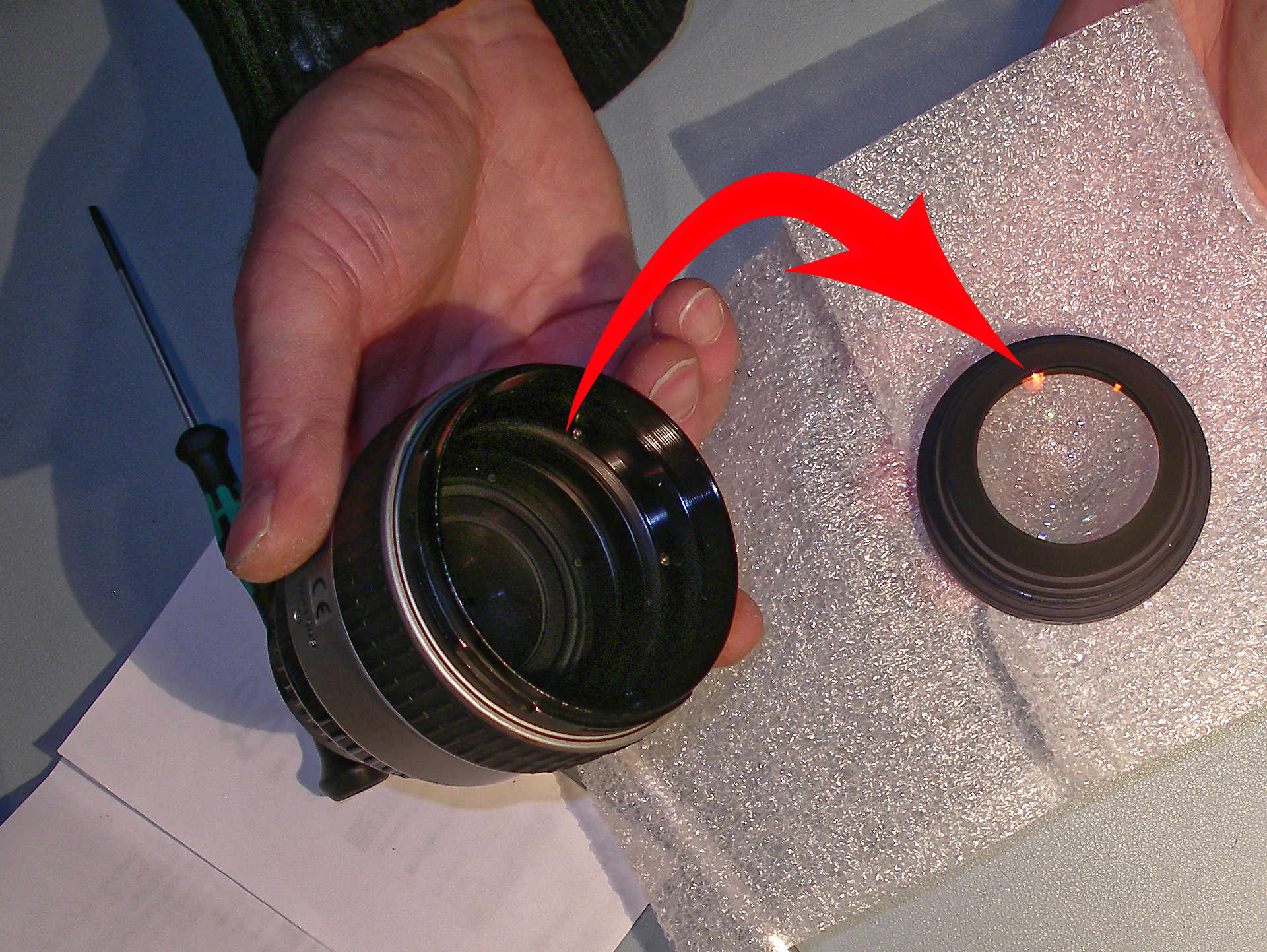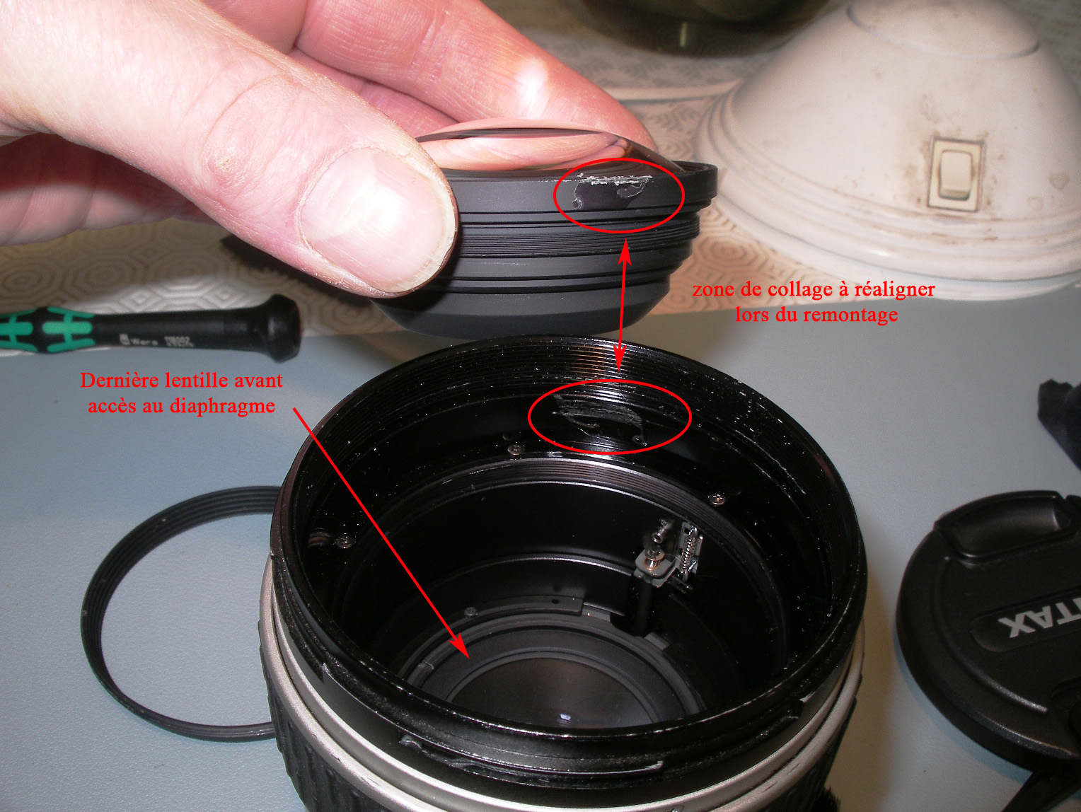 Avec un scalpel, il faut virer la goutte de colle de retenue du bloc frontal de lentilles, pour pouvoir le démonter. Ça a plus l'aspect d'une colle translucide que de frein-filet type Loctite.