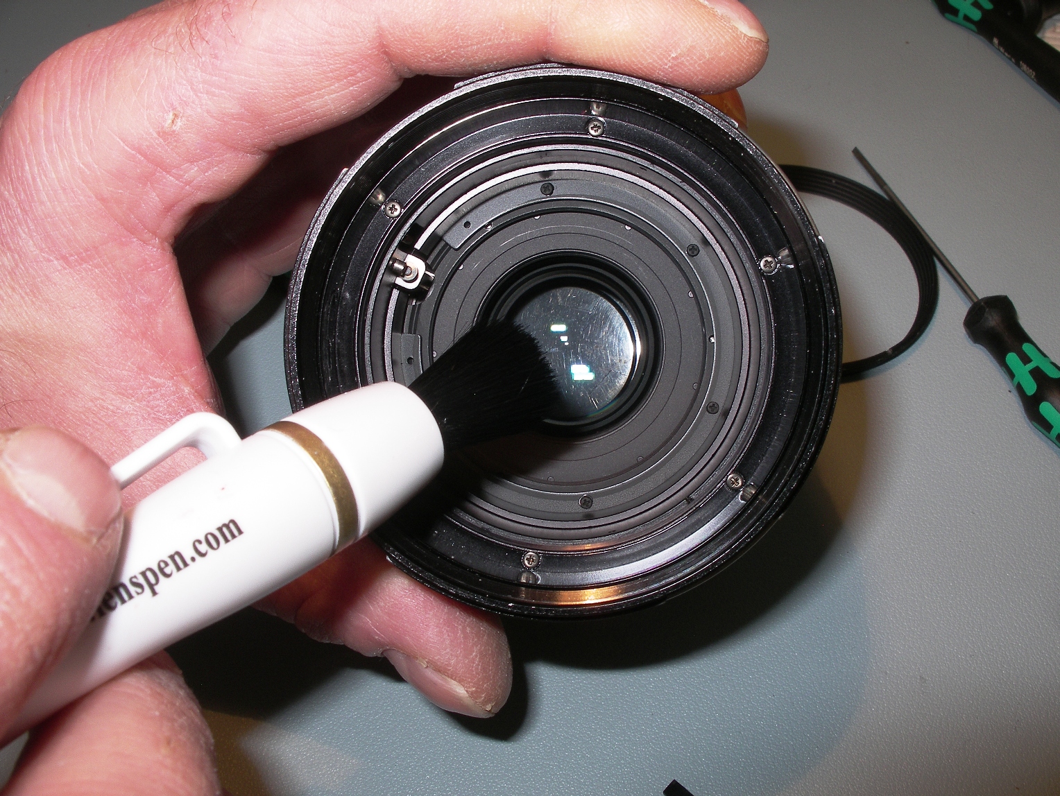 <= Nettoyage des poussières dans le plan du diaphragme. L'idéal aurait été de monter ce type de pinceau sur un aspirateur, pour le mettre en dépression, et bien retenir les poussières.